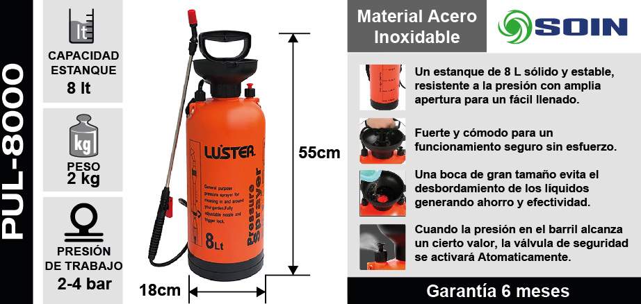 Tensión Presión de trabajo Capacidad de estanque Material de lanza Dimensiones Peso | Manual 2 - 4 bar 8L Acero inoxidable 18 x 55 cm 2Kg |